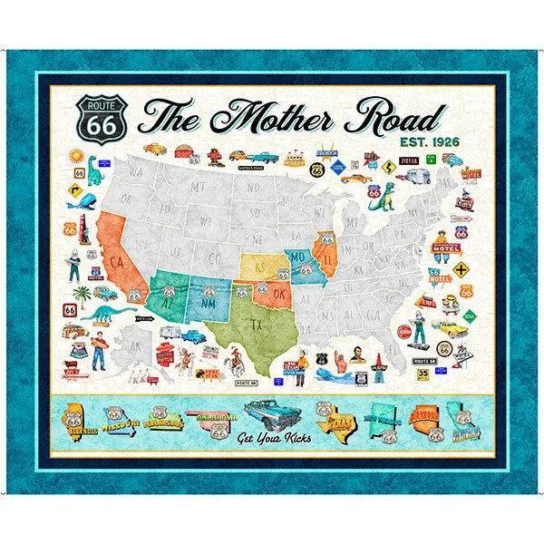 Plan your route to fun and colorful projects and celebrate 100 years of the iconic east-west highway. From cowboys to Indians, dinosaurs to astronauts, neon signs to drive in diners, this ensemble will take you on a creative trip. This antique car and motorcycle picture patches will lead the way! ©Morris Creative Group